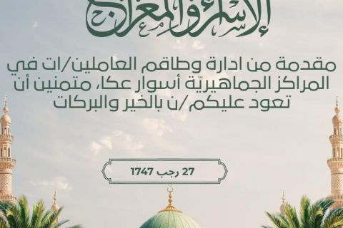 ذكرى طيبة بمناسبة ليلة الإسراء والمعراج، مقدمة من إدارة وطاقم العاملين والعاملات في المراكز الجماهيريّة أسوار عكا. متمنين أن تعود علينا المناسبة بالخير والبركات، والأمن والأمان.