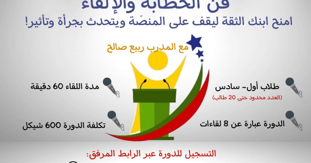دورة فن الخطابة والإلقاء: الدورة بتعطي ابنك/ بنتك الثقة بالنفس، وتشجعهم على مهارة الاستماع والاصغاء بالإضافة الى إثراء لغتهم.