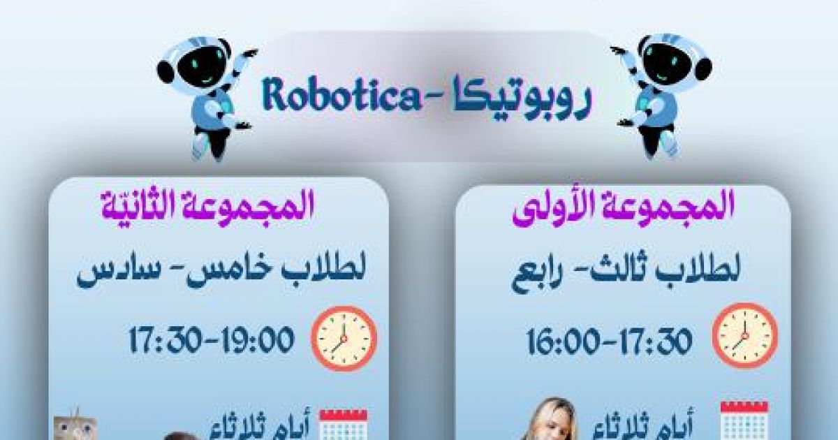 الورشة الأولى لمجموعة طلاب من صف ثالث- رابع، أيام ثلاثاء عند الساعة 16:00-17:30، والمجموعة الثانية، لطلاب خامس- سادس، أيام ثلاثاء عند الساعة 17:30-19:00.